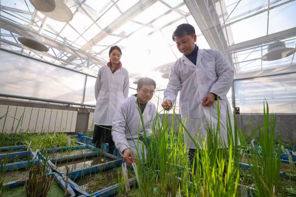 1月15日,中國水稻研究所研究員張健(右一)在研究所溫室大棚內(nèi)查看水稻樣株的生長情況。新華社記者江漢 攝