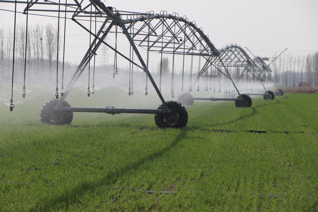 圖為種糧大戶使用自動噴灌設備給麥田澆水。(張靜 攝)