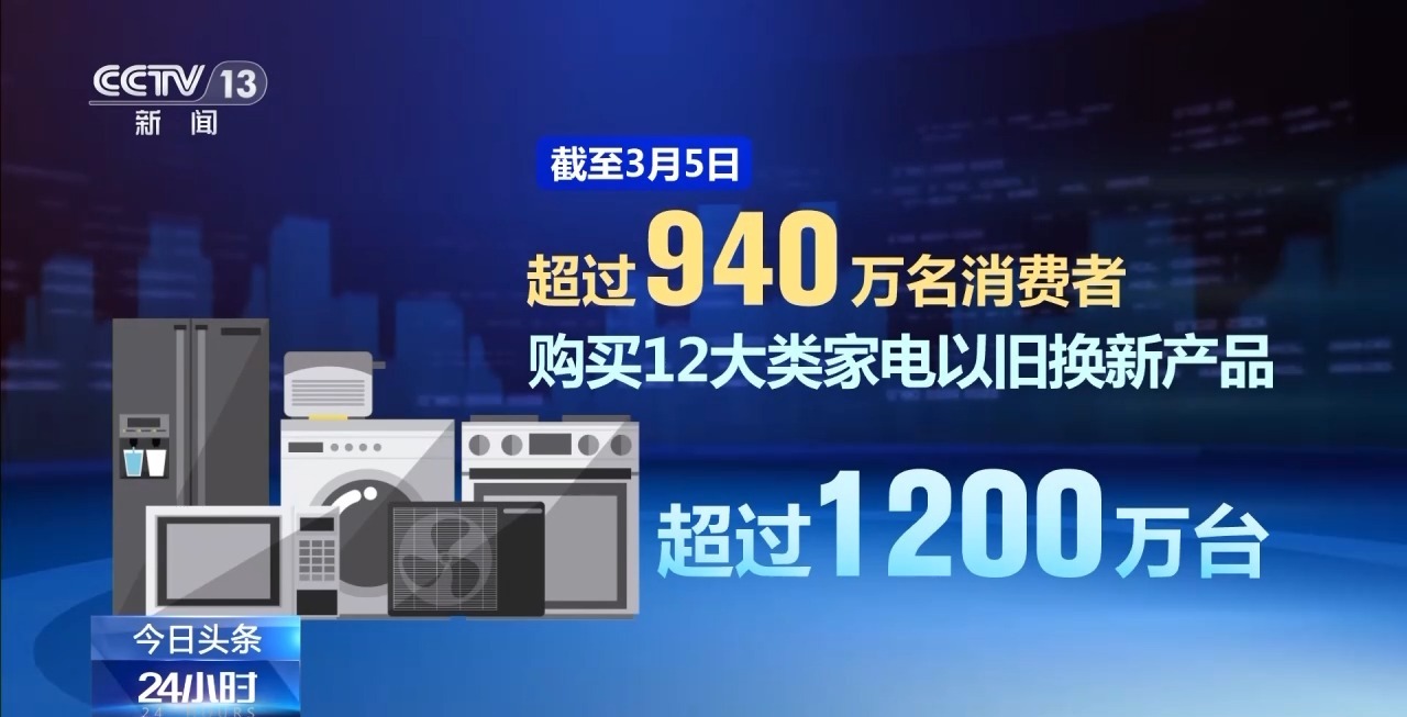 商務(wù)部數(shù)據(jù)顯示,截至3月5日,超過940萬名消費者購買12大類家電以舊換新產(chǎn)品超過1200萬臺,已有超過3400萬名消費者申請了超過4200萬件手機(jī)等數(shù)碼產(chǎn)品購新補(bǔ)貼。