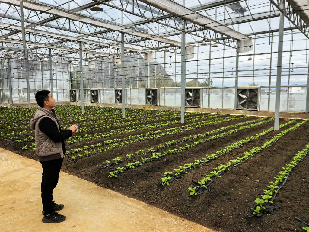 在廣西賀州市平桂區(qū)國家現代農業(yè)產業(yè)園品種篩選適應棚內,技術人員陳愈璋輕觸手機,蔬菜大棚的內遮陽網緩緩開啟?!霸绱簳r節(jié)氣溫波動較大,有了物聯網技術,可以隨時調整遮陽網開合,效率提高了很多。”陳愈璋說。