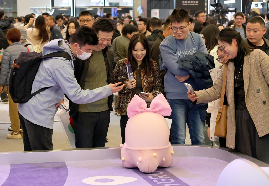 3月20日,參觀者在展會(huì)上與“Ai Me智能機(jī)器人”互動(dòng)。當(dāng)日,以“AI科技、AI生活”為主題的2025中國家電及消費(fèi)電子博覽會(huì)(AWE2025)在上海新國際博覽中心開幕。本屆展會(huì)吸引全球千余家企業(yè)參展,全景展示家電及消費(fèi)電子領(lǐng)域的前沿成果,呈現(xiàn)AI賦能智慧生活的新產(chǎn)品、新方案、新場景。(新華社記者 方喆 攝)