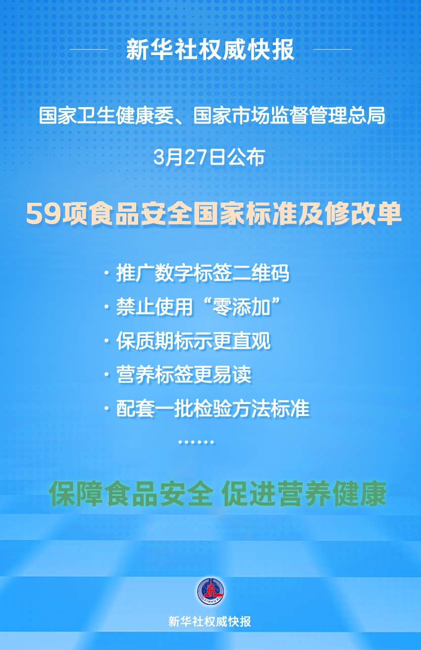 國家衛(wèi)生健康委、國家市場監(jiān)督管理總局3月27日公布了50項食品安全國家標(biāo)準(zhǔn)和9項標(biāo)準(zhǔn)修改單,這些標(biāo)準(zhǔn)與公眾日常消費的乳制品、肉制品、特殊醫(yī)學(xué)用途嬰兒配方食品、嬰幼兒輔助食品、食品添加劑、消毒劑等密切相關(guān)。