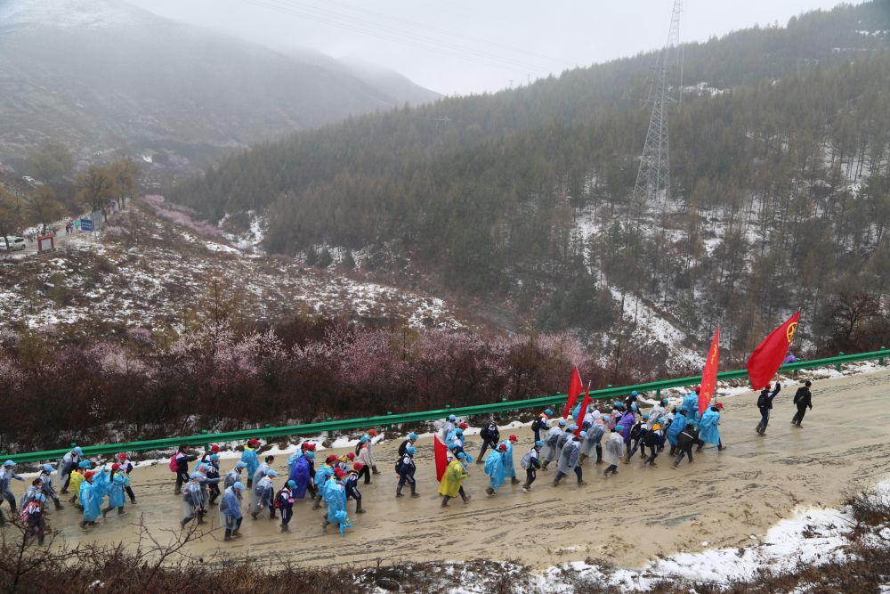 2021年,固原二中和弘文中學(xué)師生經(jīng)歷了迄今為止最艱難的一次徒步:一路上雨雪交加,很多學(xué)生的鞋子被雨水泡濕,不時(shí)陷入泥潭,相互協(xié)助才能拔出;有些路段處處泥水坑,只能一步一步趟水前行,鞋子不時(shí)“呲呲”發(fā)聲;回程時(shí)由于下山道路實(shí)在泥濘難行,不得不臨時(shí)改變線路,沿著山頂返回,拉長(zhǎng)路途……
