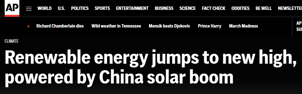 報道稱,中國太陽能熱潮推動了全球可再生能源發(fā)展。數(shù)據(jù)顯示,2024年,中國可再生能源發(fā)電新增裝機(jī)約3.74億千瓦,其中四分之三來自太陽能發(fā)電。
