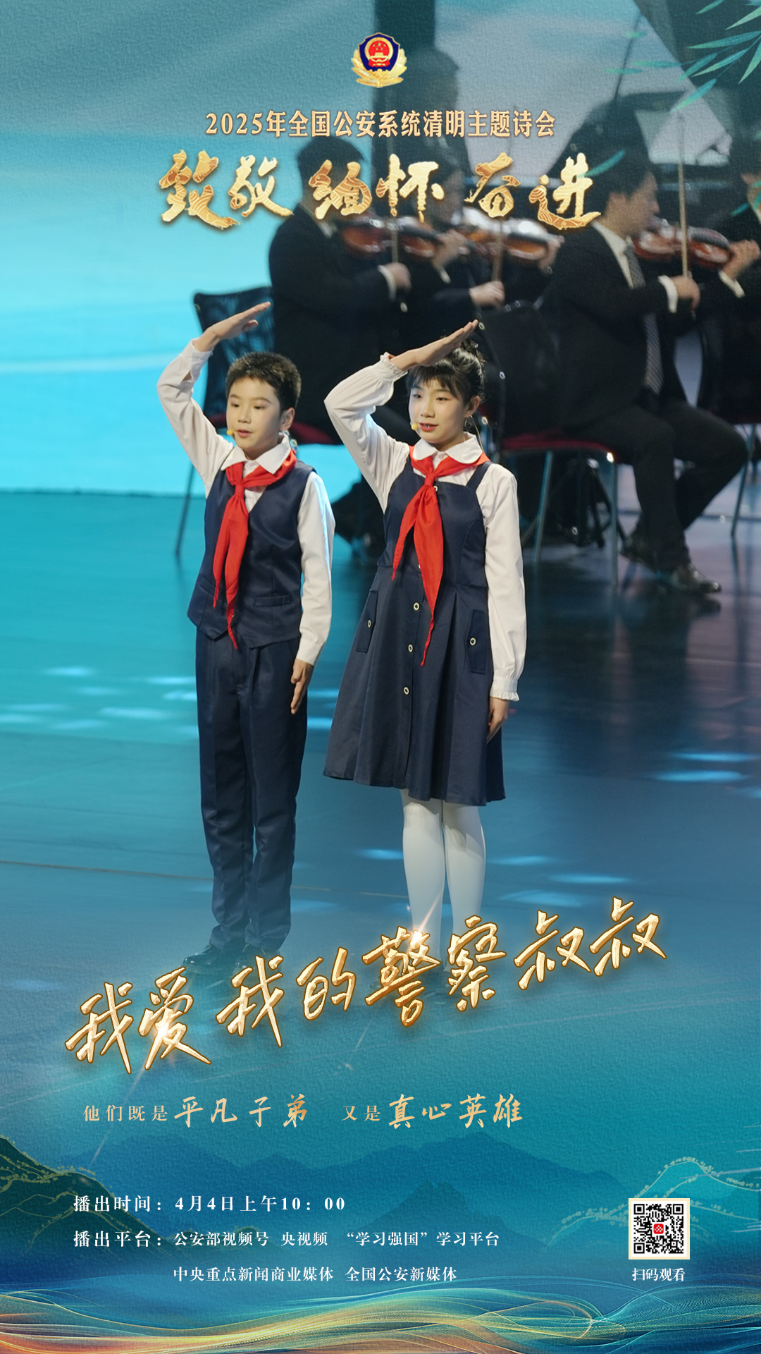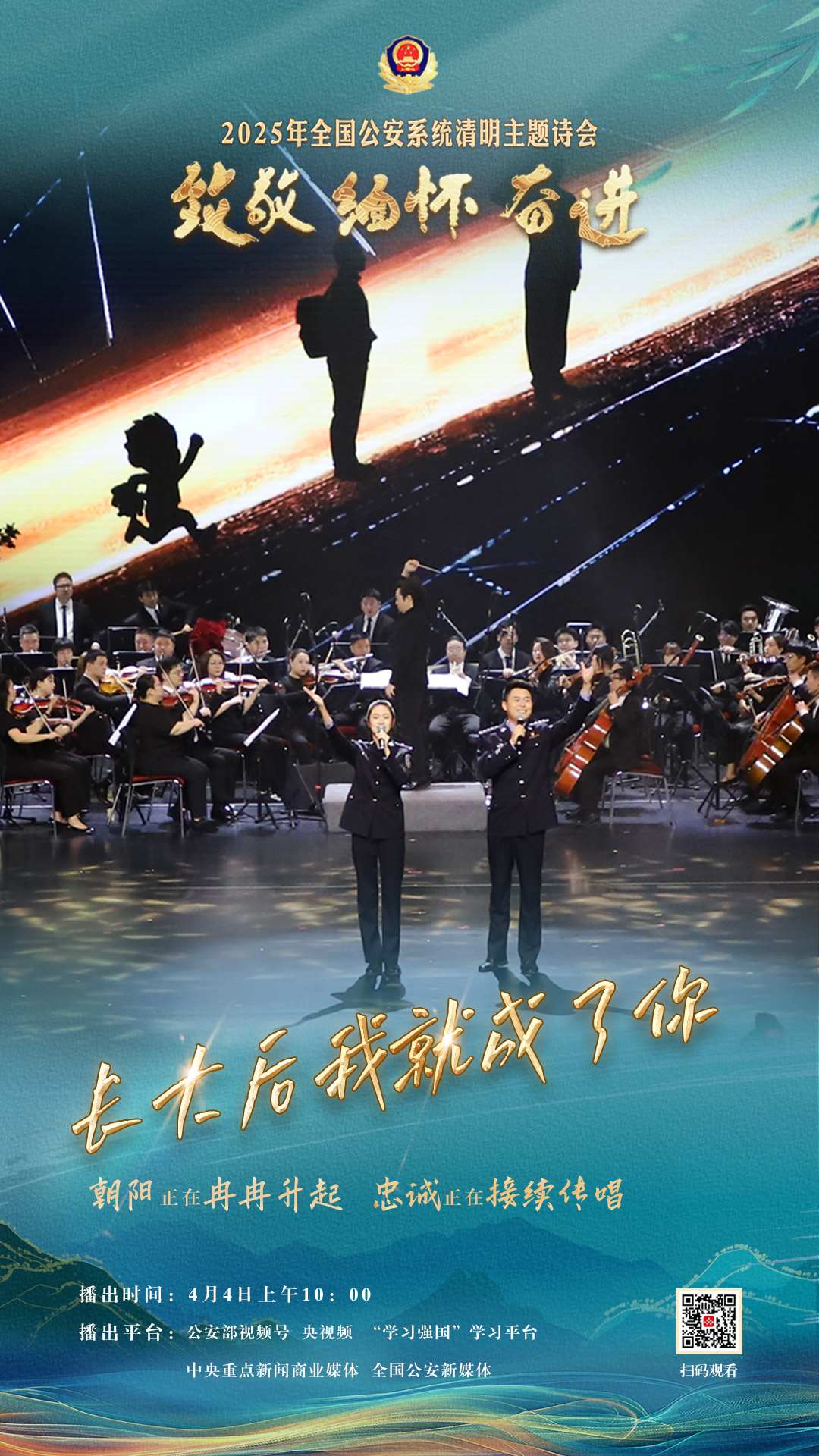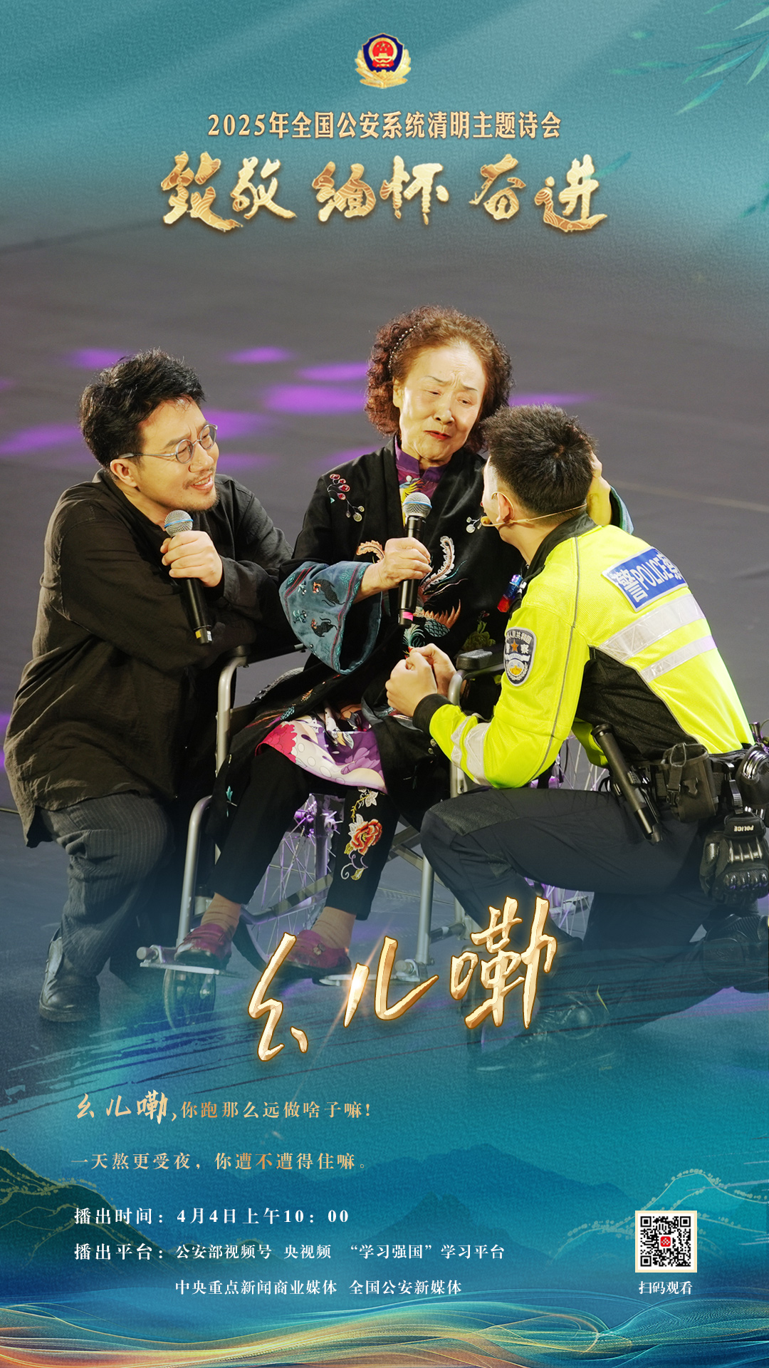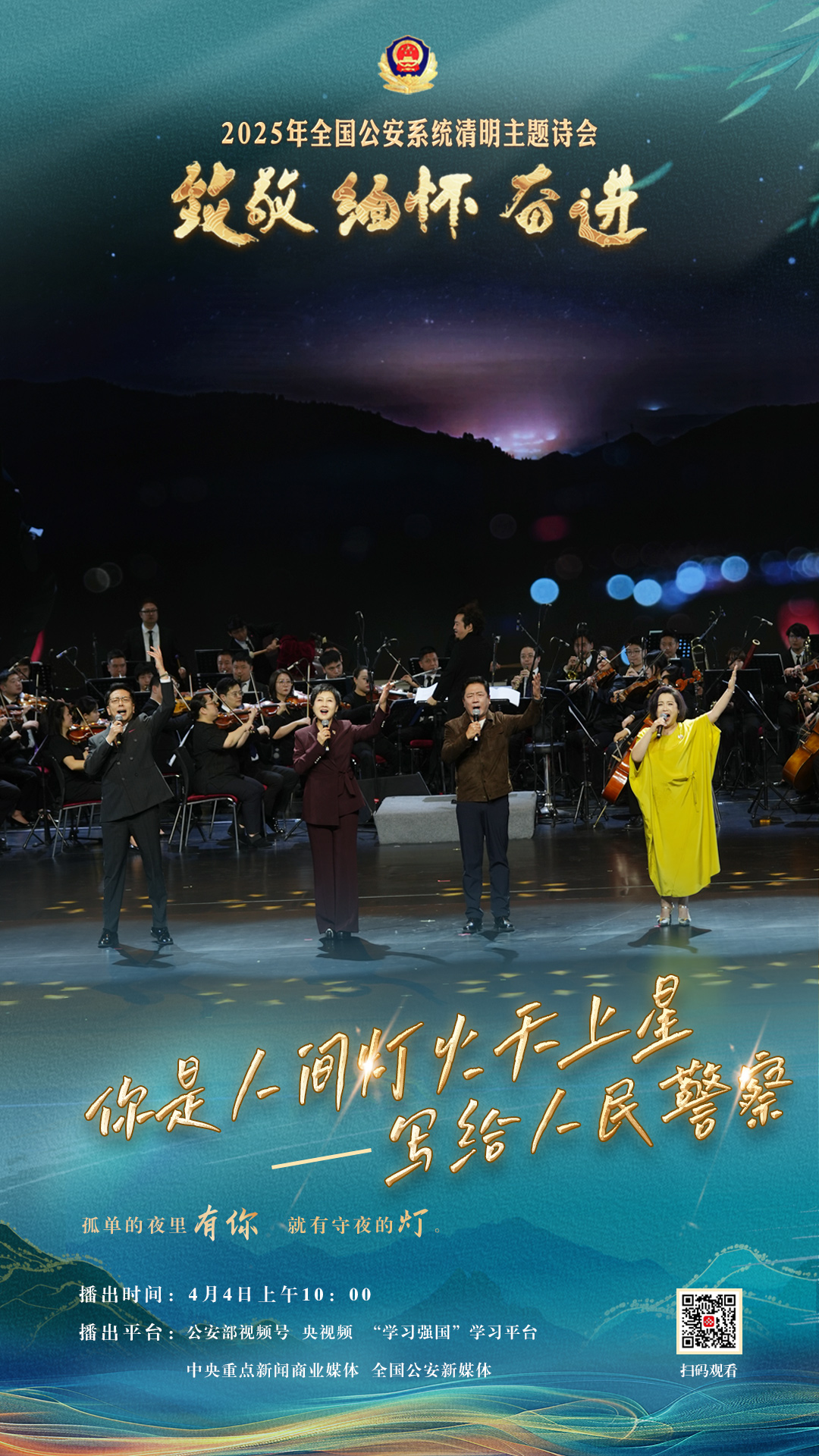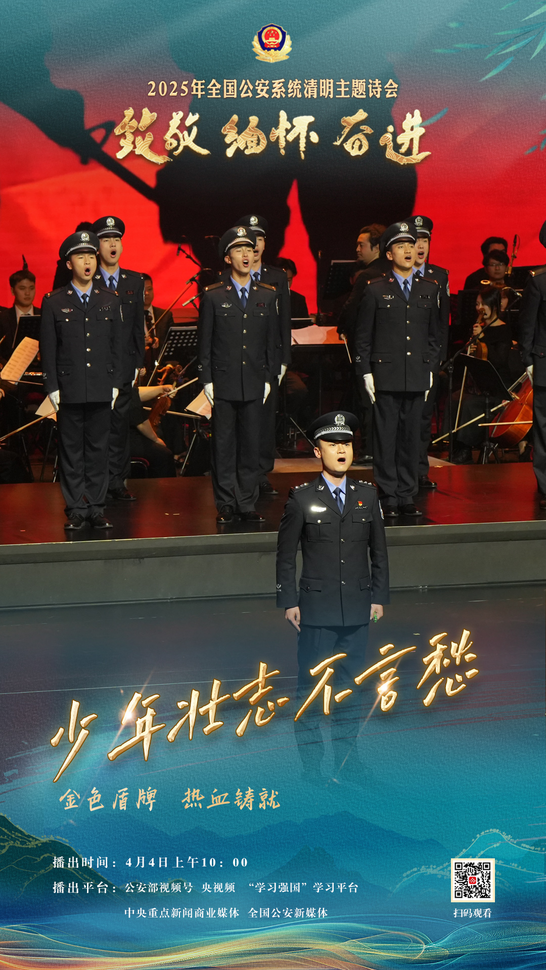 為充分展現(xiàn)全國公安機(jī)關(guān)和廣大公安民警、輔警時(shí)刻銘記習(xí)近平總書記的關(guān)心關(guān)懷,時(shí)刻為黨和人民而戰(zhàn)的忠誠政治本色,深情追憶一年來公安系統(tǒng)涌現(xiàn)的英雄模范感人事跡,激勵(lì)引導(dǎo)廣大公安民警以更加奮發(fā)有為的精神面貌,堅(jiān)決履行好黨和人民賦予的神圣職責(zé)使命,今年清明節(jié)當(dāng)天,公安部新聞宣傳局、全國公安文聯(lián)、四川省公安廳聯(lián)合舉辦“致敬·緬懷·奮進(jìn)”2025年全國公安系統(tǒng)清明主題詩會(huì)。