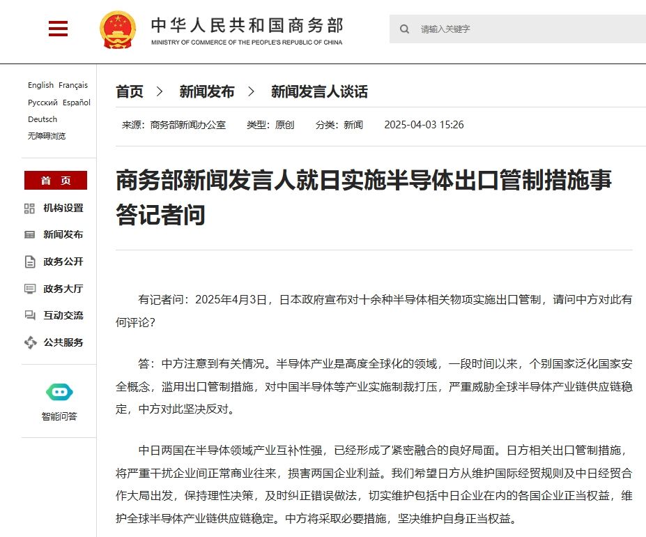 有記者問:2025年4月3日,日本政府宣布對十余種半導體相關物項實施出口管制,請問中方對此有何評論?
