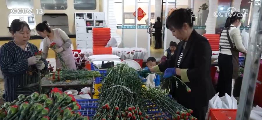 在昆明一家花卉貿(mào)易公司,記者看到,工人們正加班加點對剛剛集中采購回來的康乃馨進(jìn)行二次分級包裝。