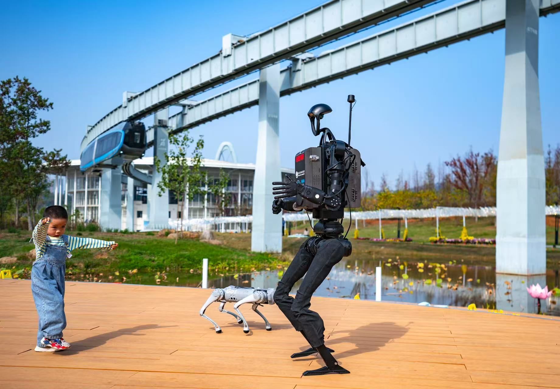 在武漢東湖高新區(qū)空軌高新大道站,一輛空軌列車正在駛過;生態(tài)大走廊上,裝載了光谷造“大腦”的人形機(jī)器人和四足機(jī)器狗,正與看AI展的小朋友斗舞。