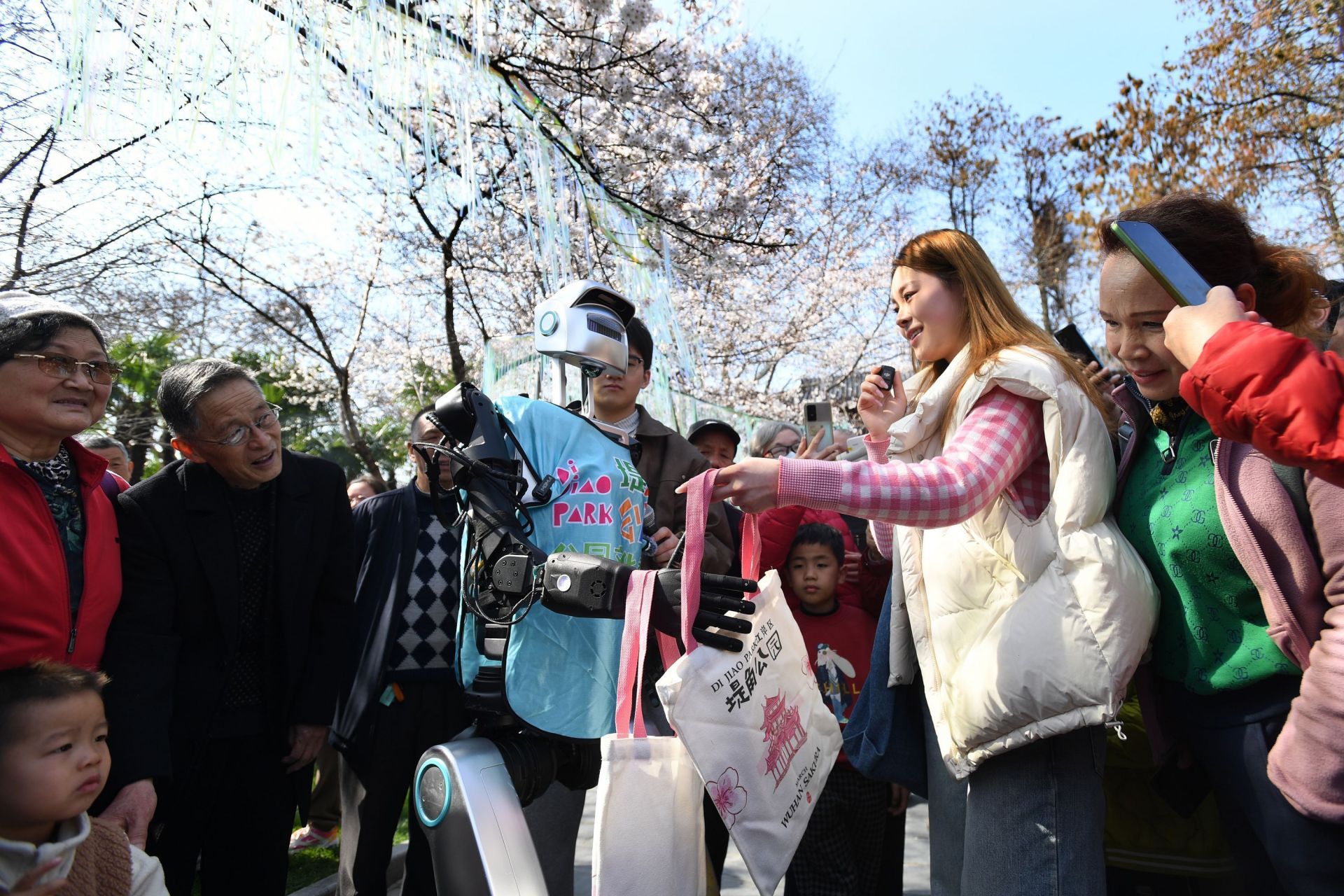 3月19日,堤角公園,人形機(jī)器人“小天”穿過櫻花云廊,精準(zhǔn)避開奔跑的孩童。