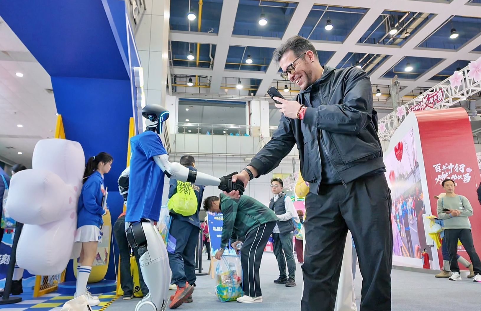 3月20日,在武漢國際會展中心,2025武漢馬拉松迎來了首個參賽選手報(bào)到領(lǐng)物日。委內(nèi)瑞拉選手吳瑞龍看見人形機(jī)器人志愿者,開心地上前與它握手。