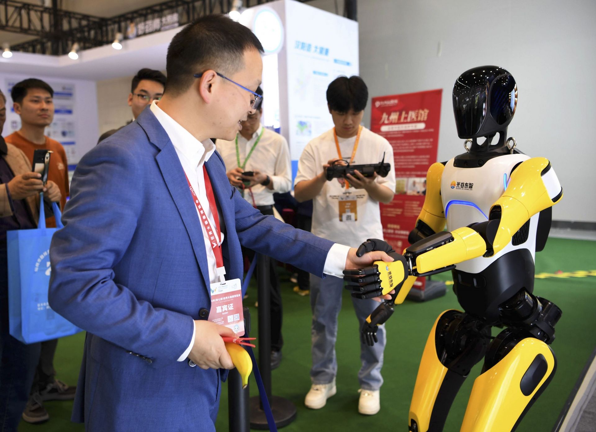 光谷東智科技展示的A2智能機(jī)器人吸引了大家的目光,不少觀眾與它握手互動。4月8日,2025年第七屆世界大健康博覽會上,智能機(jī)器人紛紛登臺。