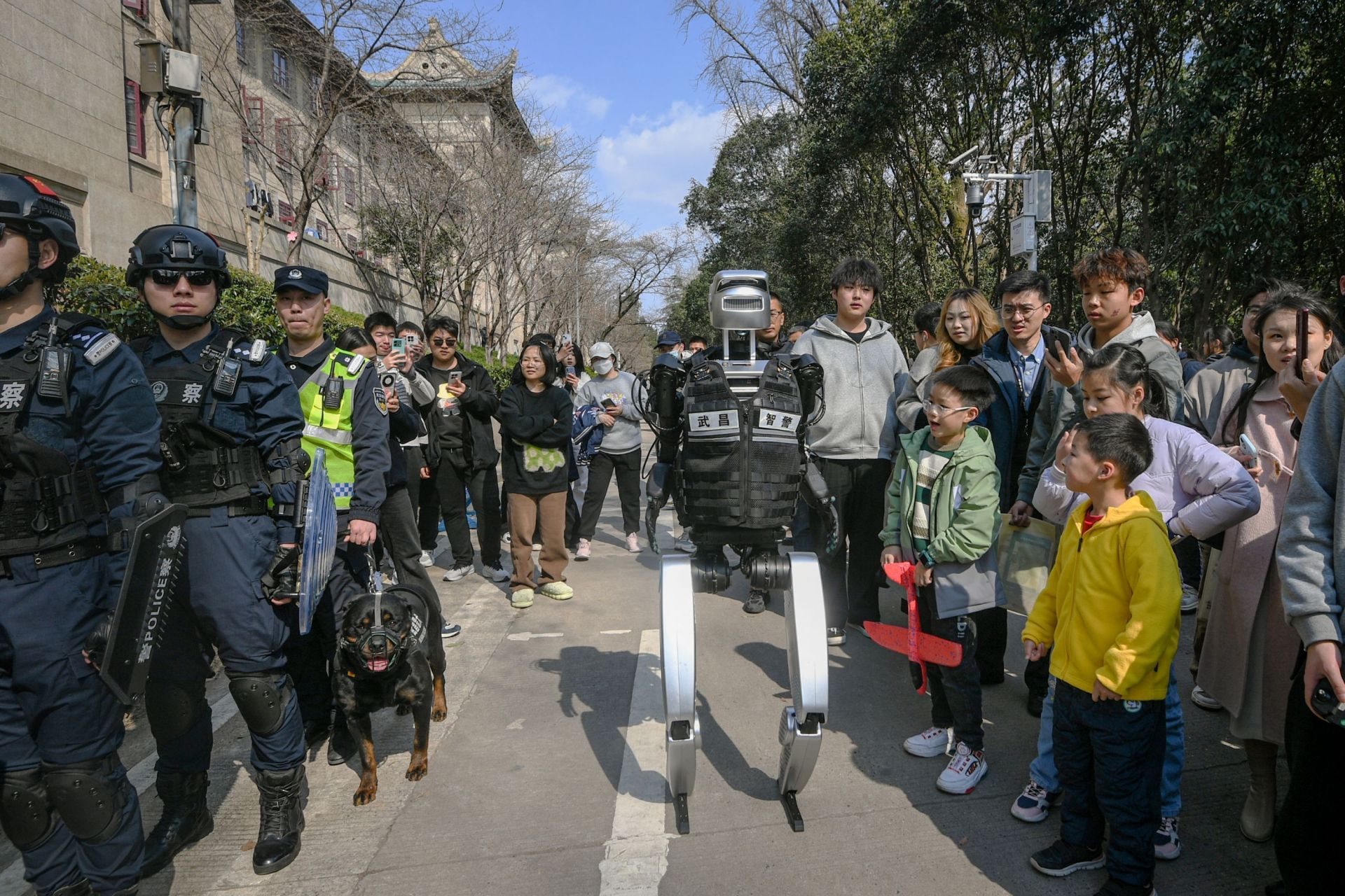3月16日,武漢大學(xué)櫻花大道上,一臺身著黑色馬甲的人形機(jī)器人“智警小珞”穿梭在賞櫻人群中。