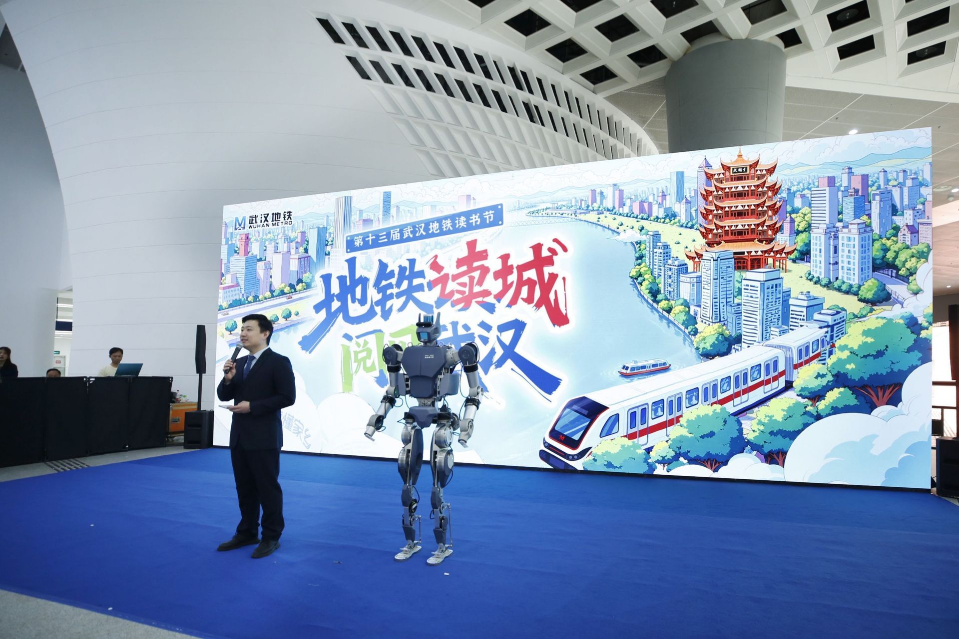 4月10日,第十三屆武漢地鐵讀書節(jié)活動在光谷廣場環(huán)形站廳拉開帷幕,由華中科技大學(xué)陳學(xué)東院士團(tuán)隊(duì)與武漢格藍(lán)若共同研制,擁有出色負(fù)載能力的湖北明星機(jī)器人“勞動者3號”登上主舞臺,擔(dān)任活動嘉賓主持。