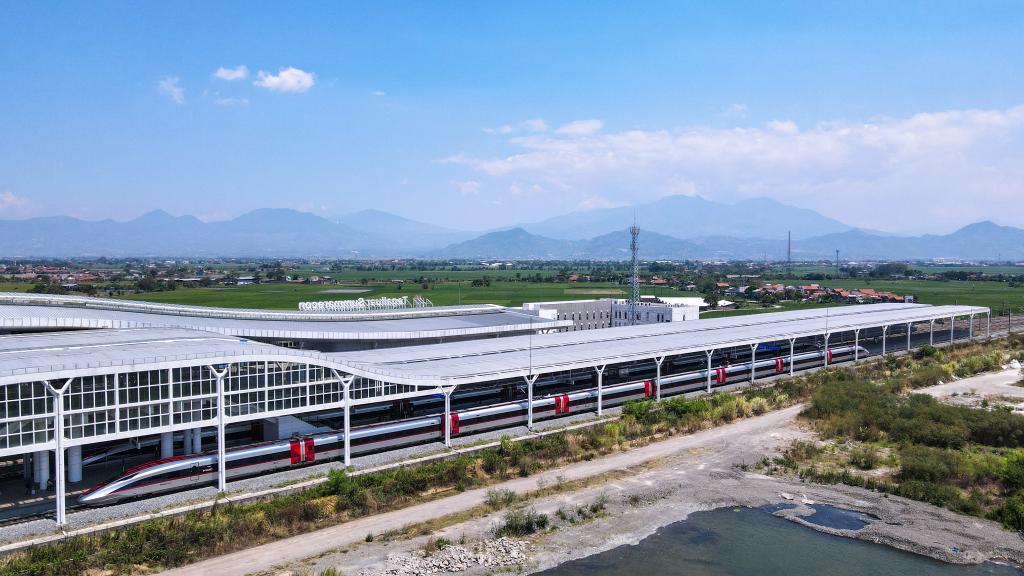 圖為2024年9月13日在印度尼西亞萬(wàn)隆德卡魯爾站拍攝的??吭谡九_(tái)上的雅萬(wàn)高鐵高速動(dòng)車組(無(wú)人機(jī)照片)。新華社記者徐欽攝