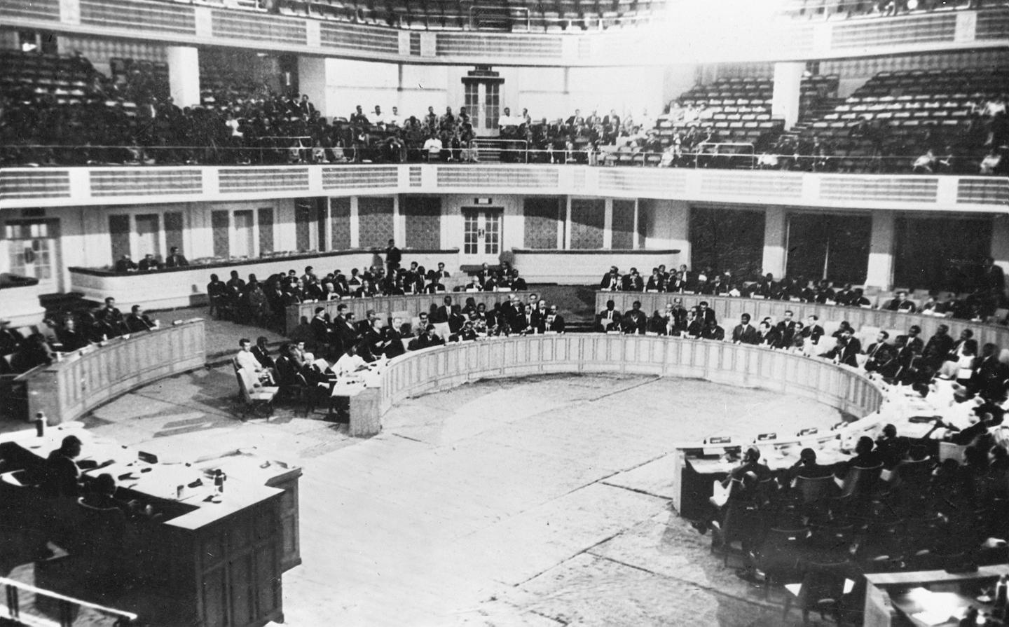 1955年4月18日至24日,29個(gè)亞非國(guó)家和地區(qū)的政府代表團(tuán)在印度尼西亞萬(wàn)隆召開(kāi)亞非會(huì)議。圖為萬(wàn)隆亞非會(huì)議會(huì)場(chǎng)內(nèi)景。新華社記者錢嗣杰攝