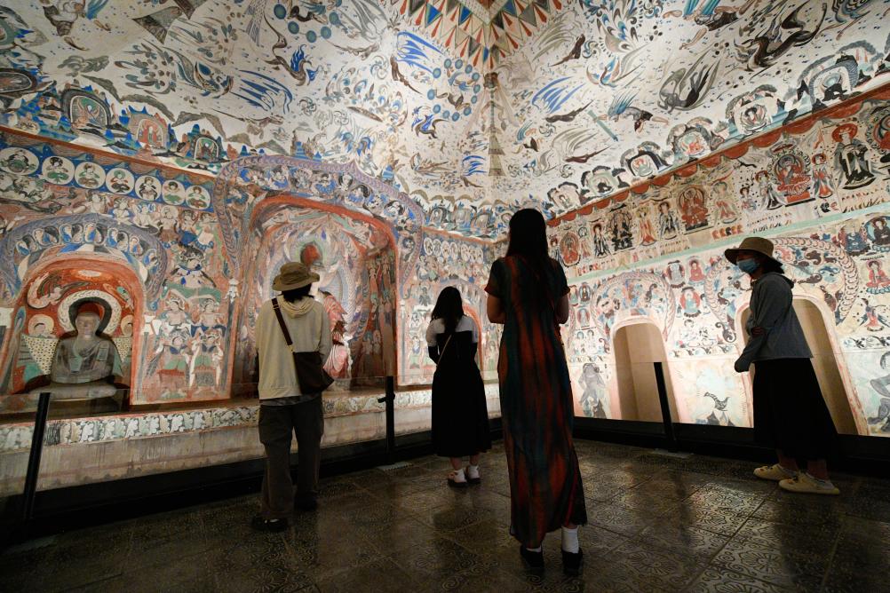 2024年6月7日,在敦煌石窟文物保護研究陳列中心,游客參觀莫高窟復(fù)制洞窟第276窟壁畫。 新華社記者 郎兵兵 攝