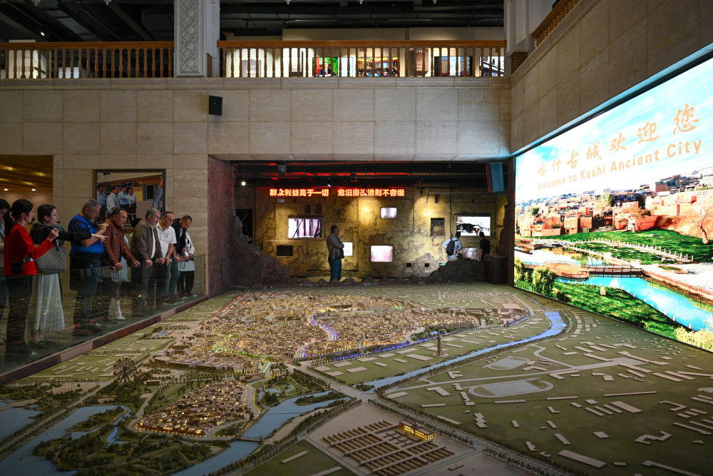 4月25日,來自埃及、伊朗、土耳其等國(guó)的外賓在喀什市老城區(qū)保護(hù)綜合治理紀(jì)念館參觀。新華社記者 辛悅衛(wèi) 攝