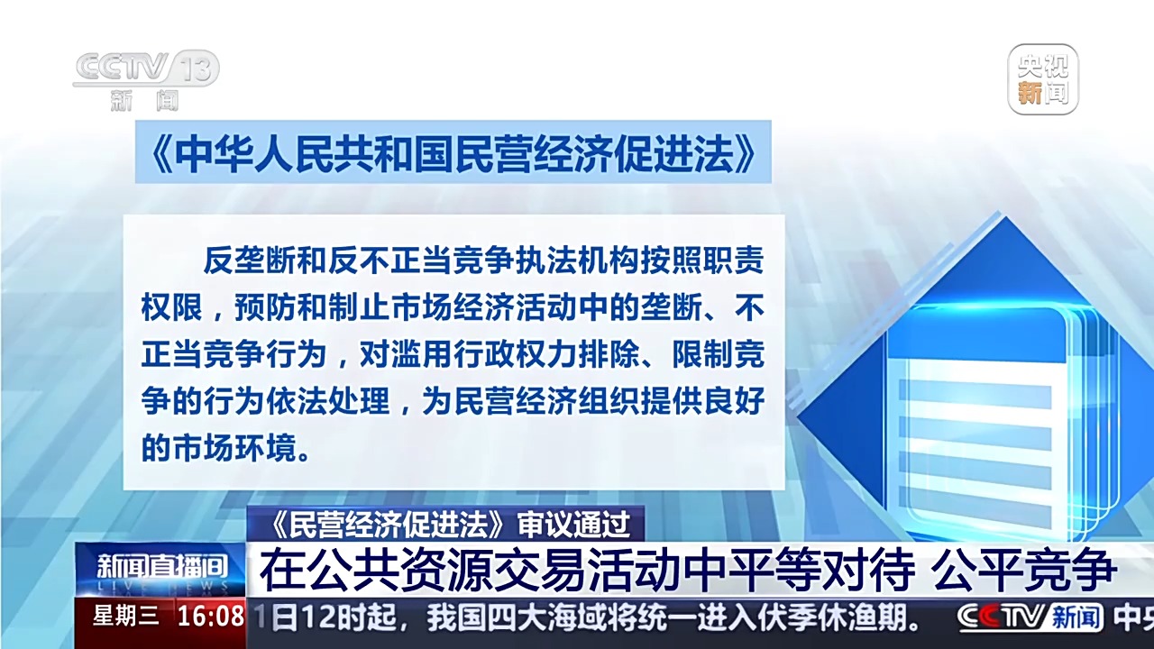 全國(guó)人大常委會(huì)法工委經(jīng)濟(jì)法室主任 楊合慶:規(guī)定市場(chǎng)準(zhǔn)入負(fù)面清單以外的領(lǐng)域,包括民營(yíng)經(jīng)濟(jì)組織在內(nèi)的各類經(jīng)濟(jì)組織可以依法平等進(jìn)入;對(duì)落實(shí)公平競(jìng)爭(zhēng)審查制度、定期清理市場(chǎng)準(zhǔn)入壁壘、禁止在公共資源交易活動(dòng)中限制或者排斥民營(yíng)經(jīng)濟(jì)組織等作出規(guī)定。