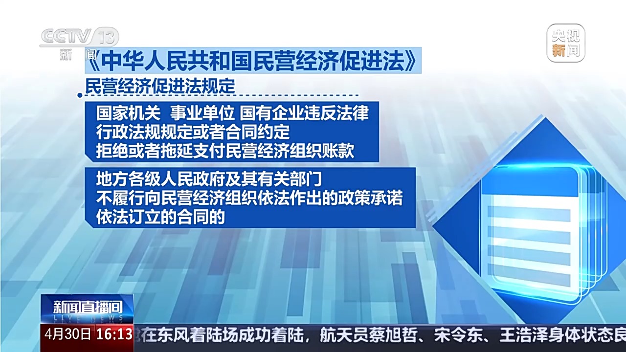 全國(guó)人大常委會(huì)法工委經(jīng)濟(jì)法室主任 楊合慶:制定民營(yíng)經(jīng)濟(jì)促進(jìn)法,第一次將“毫不動(dòng)搖鞏固和發(fā)展公有制經(jīng)濟(jì),毫不動(dòng)搖鼓勵(lì)、支持、引導(dǎo)非公有制經(jīng)濟(jì)發(fā)展”“促進(jìn)民營(yíng)經(jīng)濟(jì)健康發(fā)展和民營(yíng)經(jīng)濟(jì)人士健康成長(zhǎng)”寫(xiě)入法律,第一次明確民營(yíng)經(jīng)濟(jì)的法律地位,第一次明確規(guī)定促進(jìn)民營(yíng)經(jīng)濟(jì)持續(xù)、健康、高質(zhì)量發(fā)展,是國(guó)家長(zhǎng)期堅(jiān)持的重大方針政策。