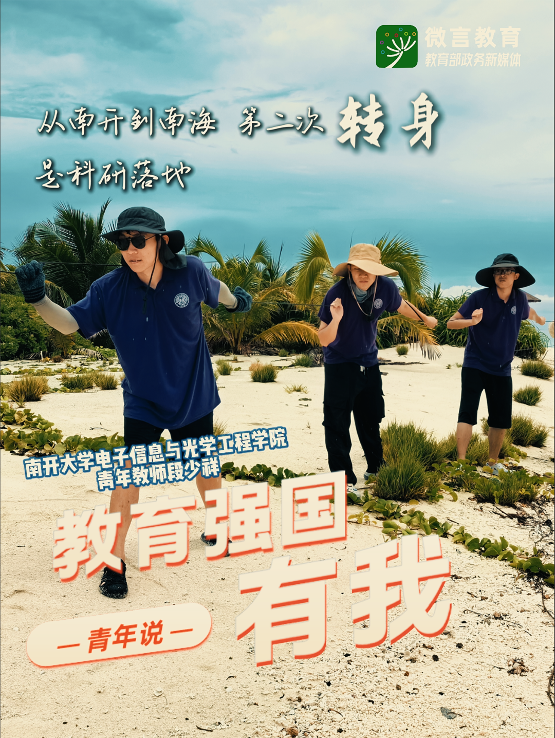 習(xí)近平總書記強調(diào),全面推進(jìn)強國建設(shè)、民族復(fù)興偉業(yè),正是年輕一代展示才華、大顯身手的好時候。教育強國建設(shè),青年何為?五四青年節(jié)之際,教育部政務(wù)新媒體啟動“教育強國,有我!”網(wǎng)絡(luò)主題宣傳活動,推出“青年說(奮進(jìn)篇)”系列,展現(xiàn)青年師生以青春之我、奮斗之我投身教育強國建設(shè)的生動實踐。今天,跟教育小微通過1個微視頻和1組海報,來看南開大學(xué)新青年用三次“轉(zhuǎn)身”寫下的青春答案——