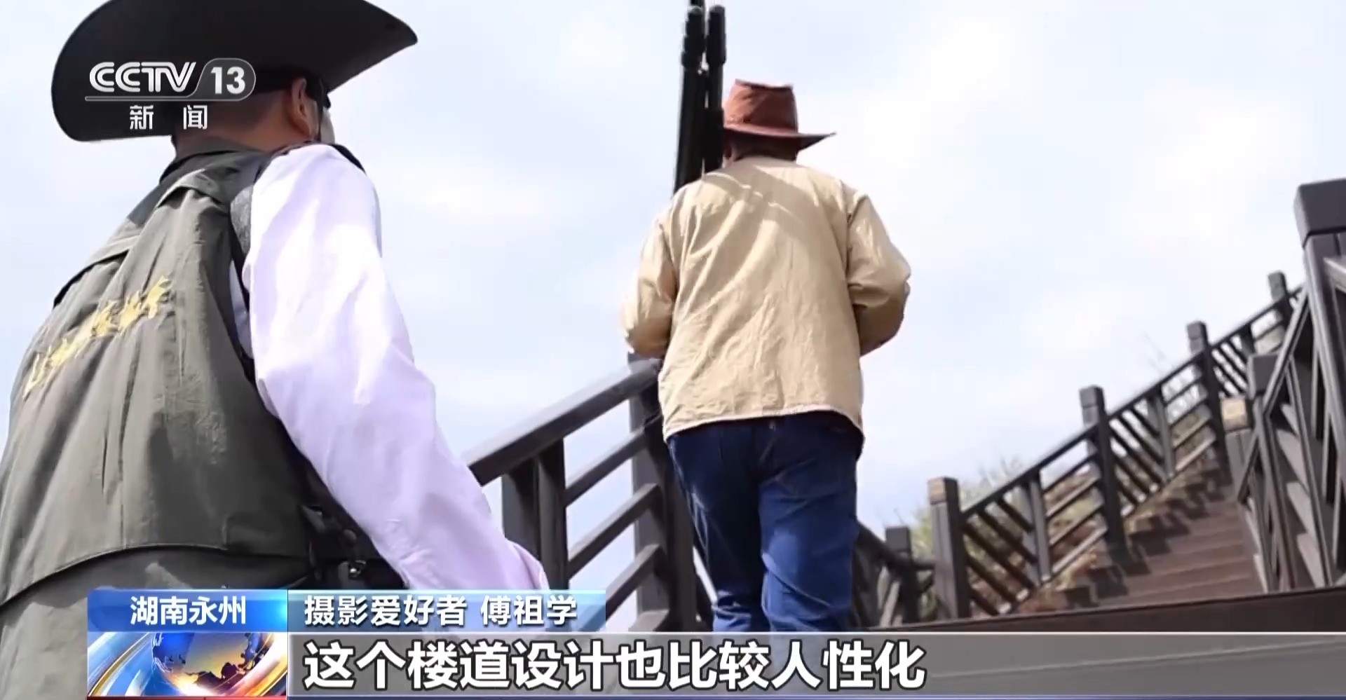 攝影愛好者 傅祖學(xué):我們在觀鳥之余,還可以順著樓道爬到山頂看風(fēng)景,這個樓道設(shè)計(jì)也比較人性化,每隔幾十米就有一個休憩的平臺,爬累了就休息一會兒。