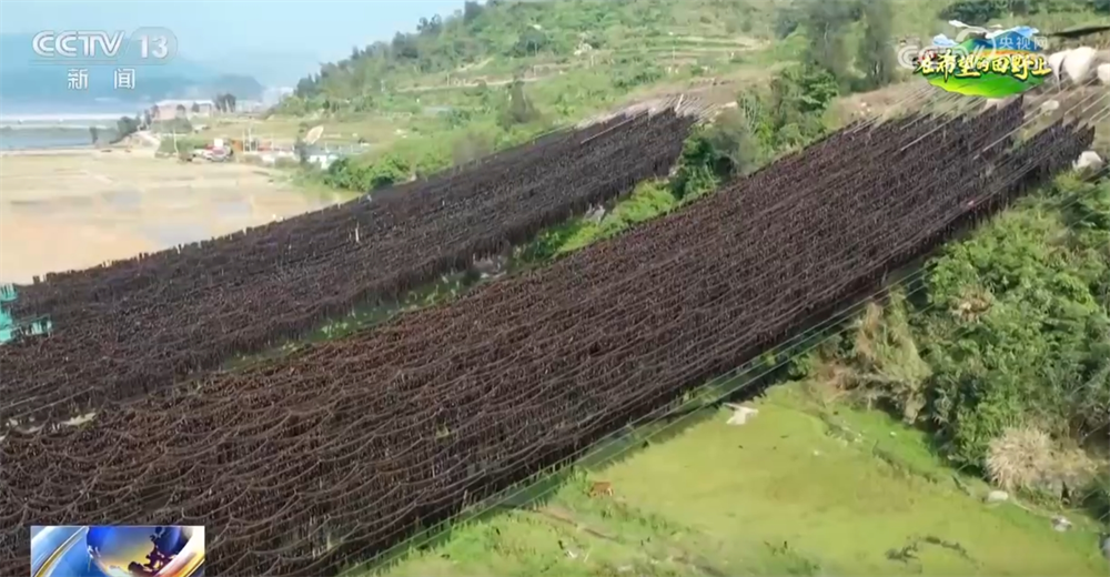 霞浦縣依山傍海,當(dāng)?shù)仞B(yǎng)殖戶巧妙利用地形的高低差,借助電動(dòng)滑輪將海帶從山腳掛至半山腰晾曬。