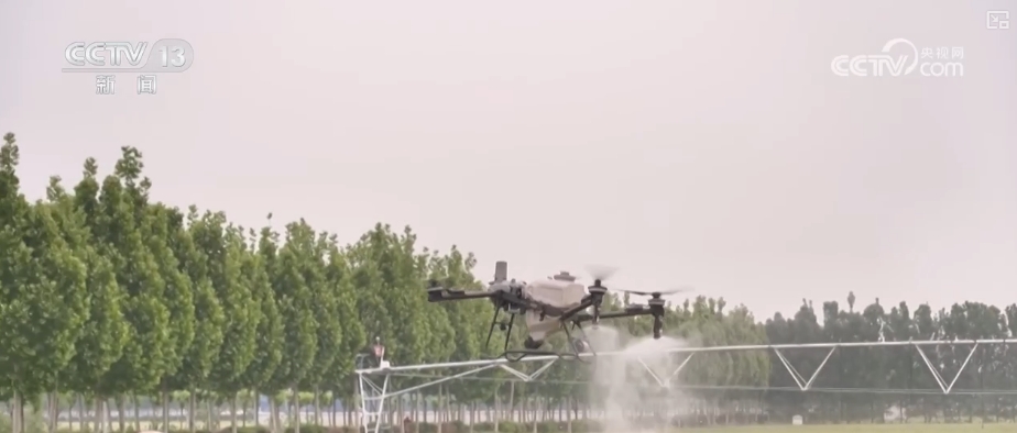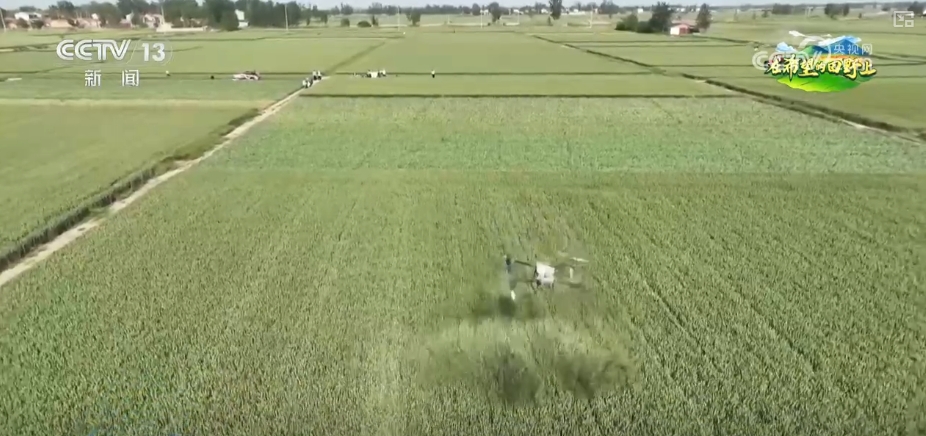 根據(jù)物聯(lián)網(wǎng)蟲情監(jiān)測系統(tǒng)提供的信息,植保無人機(jī)在麥田上精準(zhǔn)噴灑混合液。