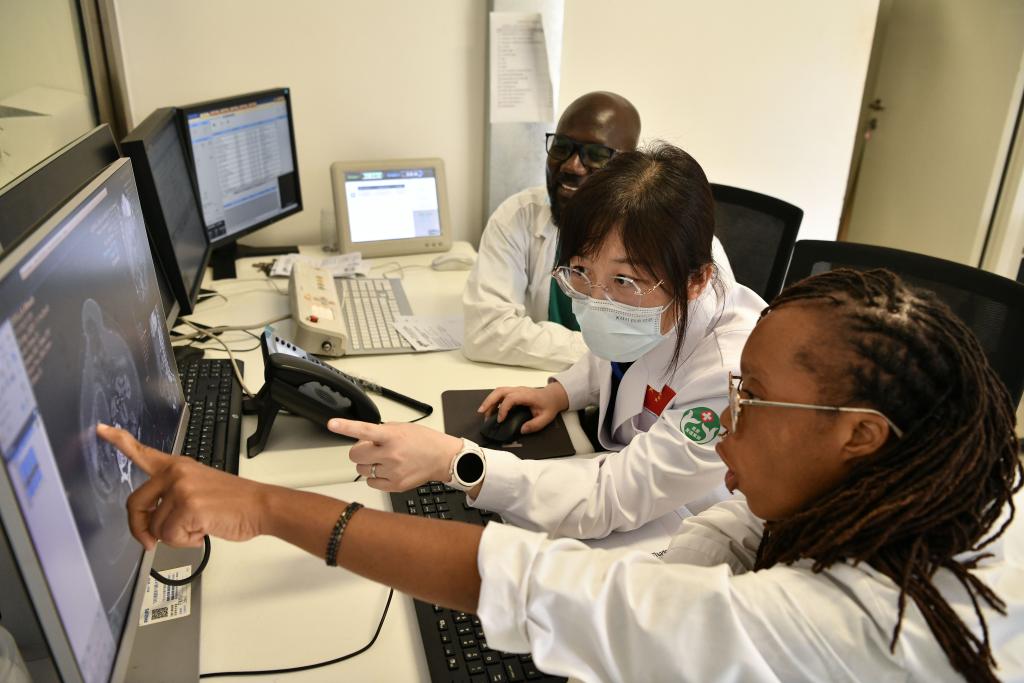 清晨的幾內(nèi)亞首都科納克里,陽光穿透中幾友好醫(yī)院新啟用的醫(yī)療綜合樓玻璃幕墻,灑在走廊上。來自中國的放射科醫(yī)生劉朋與幾方主任阿梅莉·拉馬正俯身在一臺1.5T磁共振儀器前,仔細分析一名患者的脊柱影像。兩人時而比劃手勢,時而切換中法雙語交流,最終在診斷報告上簽下共同意見。