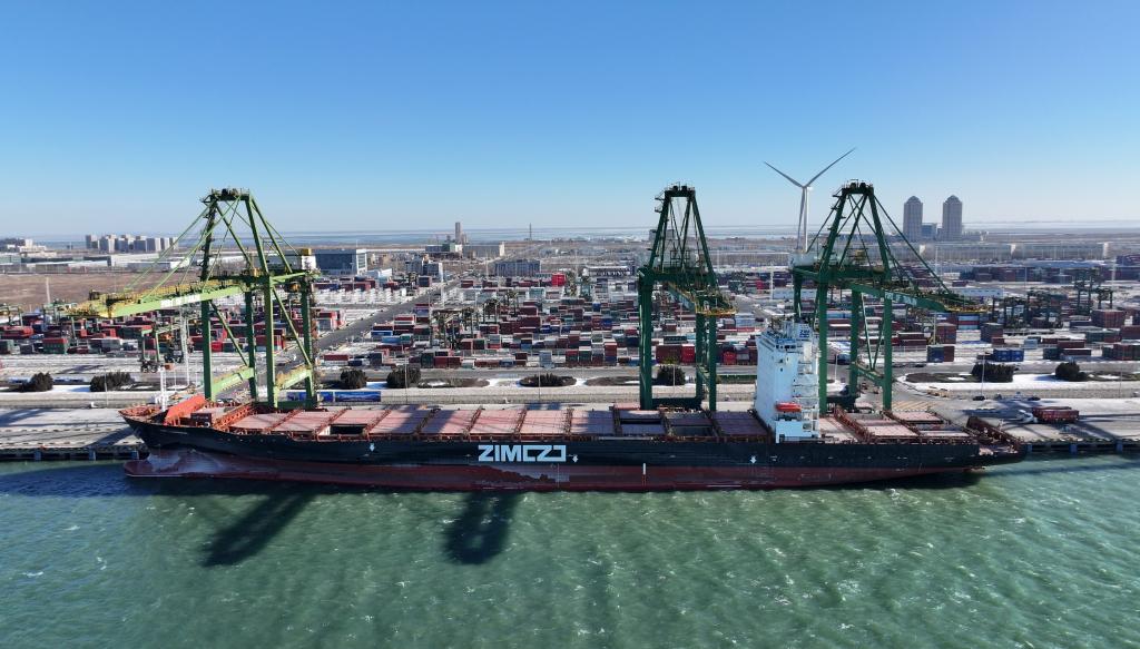 2023年12月21日,“羅安達(dá)輪”集裝箱船靠泊在天津港(無人機(jī)照片)。當(dāng)日,“羅安達(dá)輪”集裝箱船正式從天津港出發(fā),駛向哥倫比亞、厄瓜多爾、秘魯、智利等南美洲國家,標(biāo)志著天津港正式開通天津—南美西新航線。新華社記者 趙子碩 攝