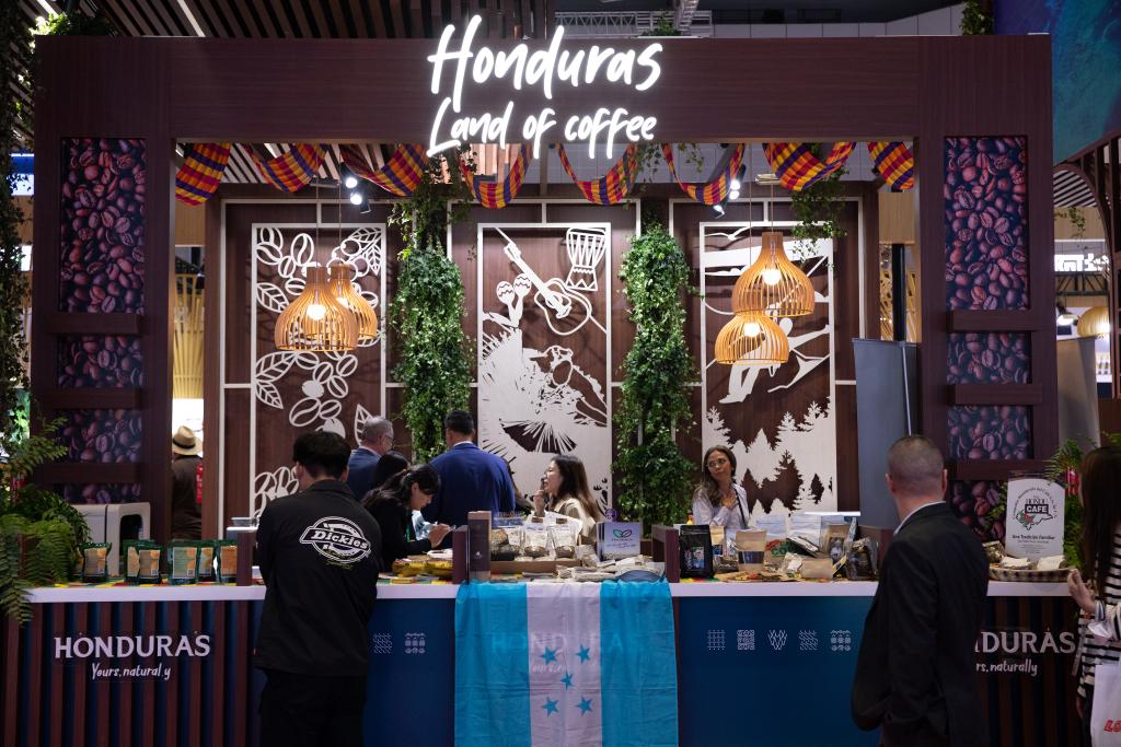 2023年11月6日,參觀者在第六屆進(jìn)博會(huì)國家展洪都拉斯展臺(tái)咨詢咖啡豆等展品信息。新華社記者 金立旺 攝