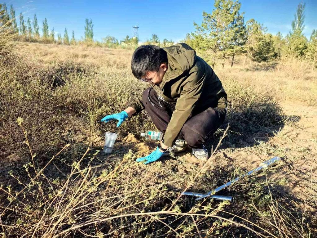 頂著烈日,步行半個(gè)小時(shí)走進(jìn)荒野深處,一片經(jīng)過(guò)人工修復(fù)的沙地便是農(nóng)皓鈞的實(shí)驗(yàn)樣地。他熟練地?cái)Q動(dòng)鉆頭,挖出一個(gè)個(gè)小坑,放入透明杯子,再倒上酒精,“一周后來(lái)回收,有可能看到甲蟲(chóng)等節(jié)肢動(dòng)物”。