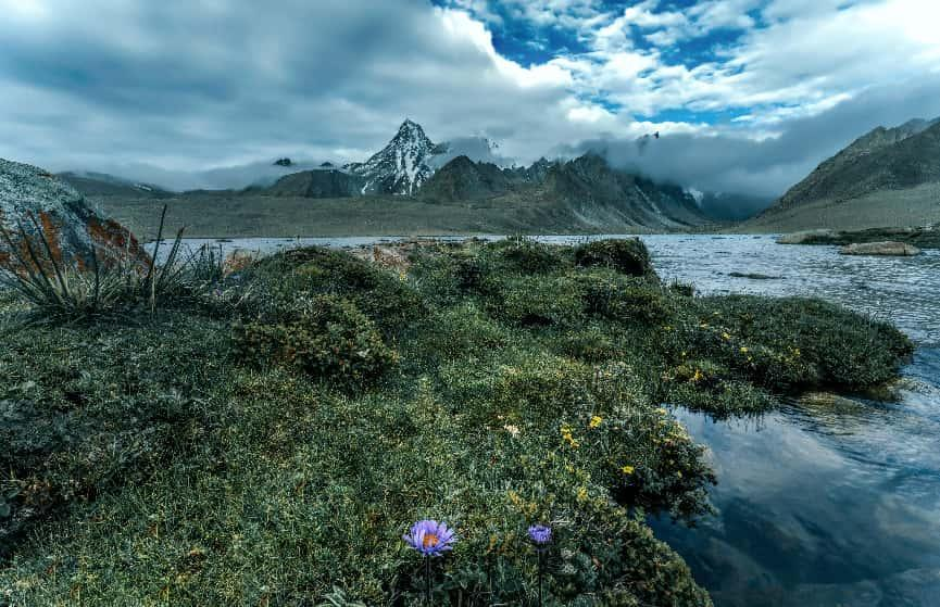 第二天一早,我們繼續(xù)向山脈的腹地去探索,前往冷布崗日腹地的道路也是無(wú)人踏足的,沒有正規(guī)車道的,所以我們同樣只能沿著牧民留下的車轍印前行。在一望無(wú)際的高原上,我們找不到路的時(shí)候就操縱無(wú)人機(jī)升空去探索路線。經(jīng)過了一整天的艱難探索,終于抵達(dá)了目的地,這個(gè)地方再往上走是完全沒有路了。在海拔約5800米左右的這個(gè)地方,不僅有巍峨壯美的雪山,還長(zhǎng)著很多這種獨(dú)特的高山苔蘚,這種植被通常只分布在海拔4000米以上的地區(qū),極具地域特色。所以在拍攝時(shí),我將這些高原特有的植被作為前景,既展現(xiàn)了高原生態(tài)風(fēng)貌,也作為海拔高度的天然標(biāo)識(shí),然后遠(yuǎn)處雄偉的冷布崗日雪山則構(gòu)成了畫面的核心部分。