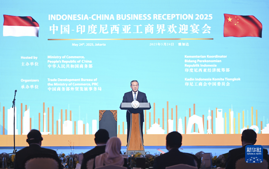 當?shù)貢r間5月24日晚,國務(wù)院總理李強在雅加達同印度尼西亞總統(tǒng)普拉博沃共同出席中國-印尼工商界晚宴并致辭。兩國約200名工商界代表參加。