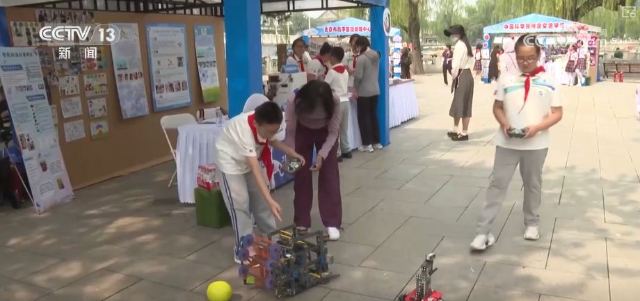 “科技強國”小學生社團風采展示活動也在現場同步開展。來自北京各個學校的少先隊科技社團齊聚一堂,孩子們興致盎然地分享自己設計拼裝的投球機器人、巡防機器人、智能消毒碗柜等精彩紛呈的科技成果。