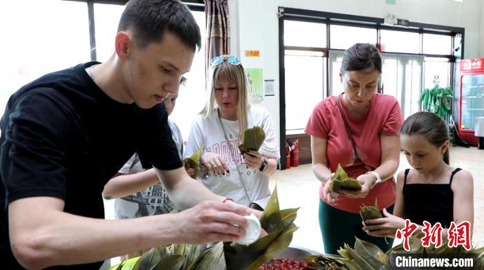 俄羅斯游客在雙鴨山市饒河縣學(xué)習(xí)包粽子。 饒河縣融媒體中心供圖