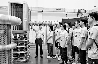 中國原子能科學研究院研究員在瑞昌核物理應(yīng)用研究院向?qū)W生們講解我國自主研發(fā)的AMS加速器。魏東升攝/光明圖片