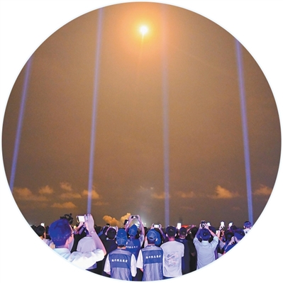 “5,4,3,2,1”——火箭的火焰照亮夜幕,平臺的光束射向天際……19時(shí)50分,火箭發(fā)射升空,游客們舉著手機(jī)記錄,現(xiàn)場歡呼聲陣陣?!昂芘d奮、很震撼,感覺一伸手就能‘抓’到火箭。”延鈺菲說。