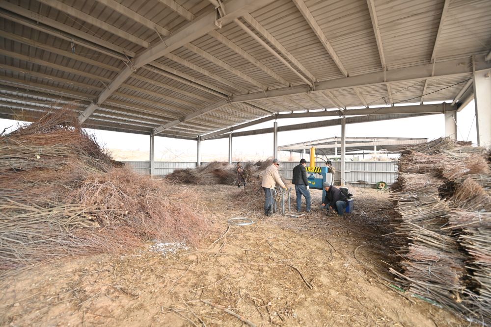 農(nóng)牧民們正在使用割灌機加工紅柳枝條。新華社記者 馬金瑞 攝