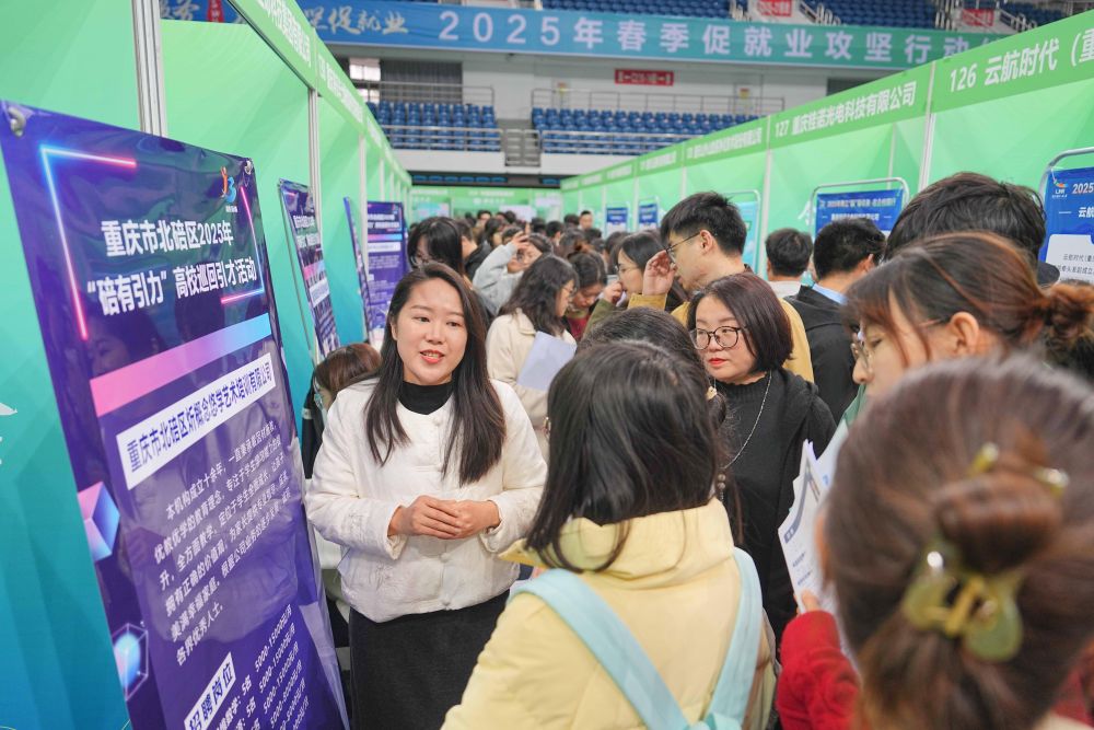 3月28日,西南大學(xué)應(yīng)屆畢業(yè)生在2025年春季促就業(yè)攻堅行動綜合類雙選會現(xiàn)場了解崗位信息?;顒友堁b備制造、新能源、數(shù)字信息、綠色化工、基礎(chǔ)教育、醫(yī)療衛(wèi)生等行業(yè)領(lǐng)域企業(yè)參與,為畢業(yè)生搭建廣闊多元的就業(yè)平臺。新華社發(fā)(秦廷富攝)
