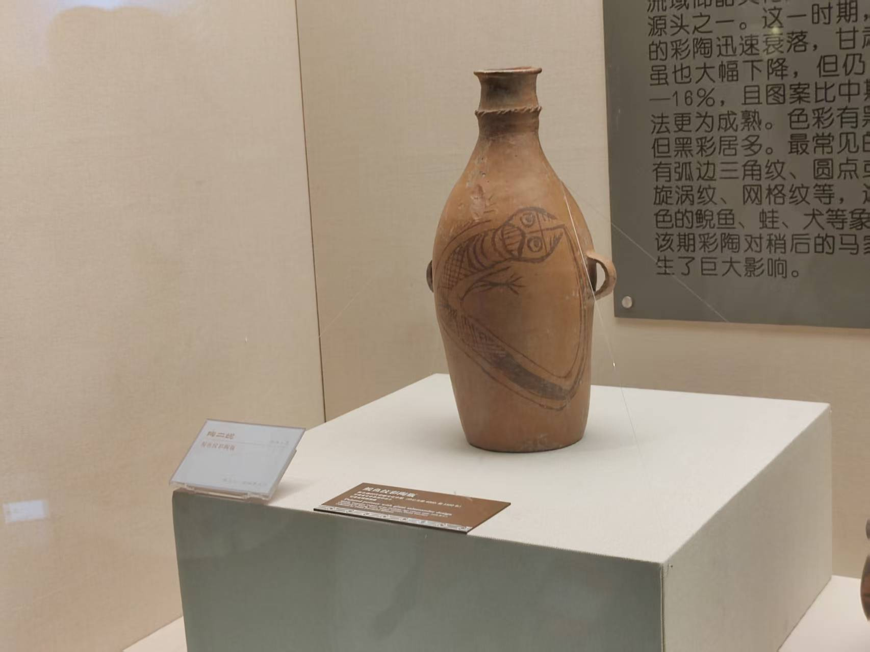 在“彩陶之鄉(xiāng)”主題展區(qū),仰韶文化鯢魚紋彩陶瓶成為焦點。這件距今5500年的陶瓶,腹部繪有人面鯢魚紋,被認為是早期“龍圖騰”的雛形?!八赡苁欠诵蜗蟮某橄蟊磉_,印證了甘肅作為中華文明重要發(fā)源地之一?!敝v解員介紹。作為甘肅唯一一件彩陶類國寶,其神秘圖案引發(fā)了采訪團對史前先民精神世界的無限遐想。