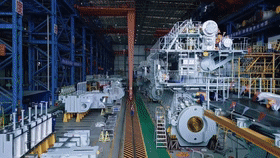 記者在位于青島西海岸新區(qū)的中船發(fā)動機(jī)生產(chǎn)車間內(nèi)看到,一臺四五層樓高的船舶發(fā)動機(jī)正在緊張安裝當(dāng)中。
