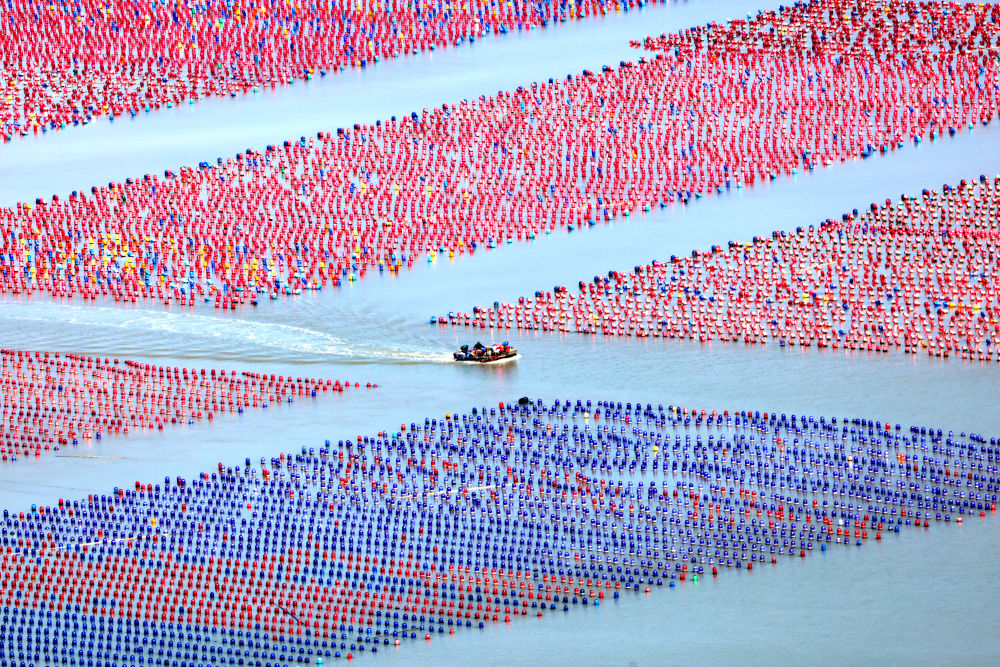3月18日,福建省寧德市霞浦縣三沙鎮(zhèn)海域的海洋牧場,養(yǎng)殖工人在進(jìn)行養(yǎng)殖作業(yè)。新華社發(fā)(王旺旺攝)