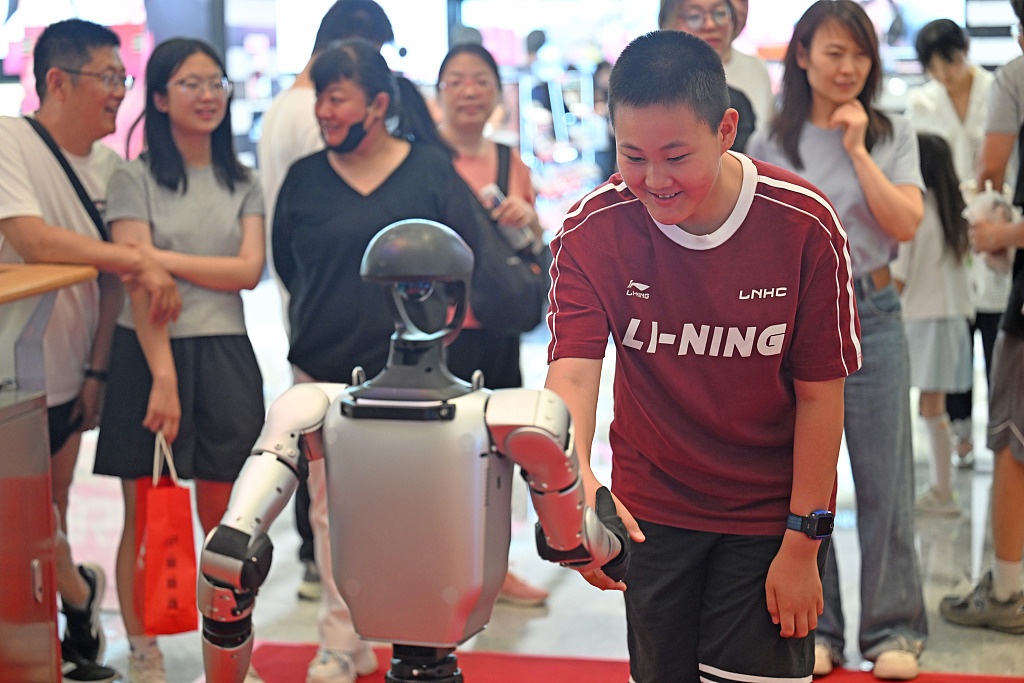 2025年5月2日,湖北宜昌的消費(fèi)者與人形機(jī)器人進(jìn)行互動(dòng)。