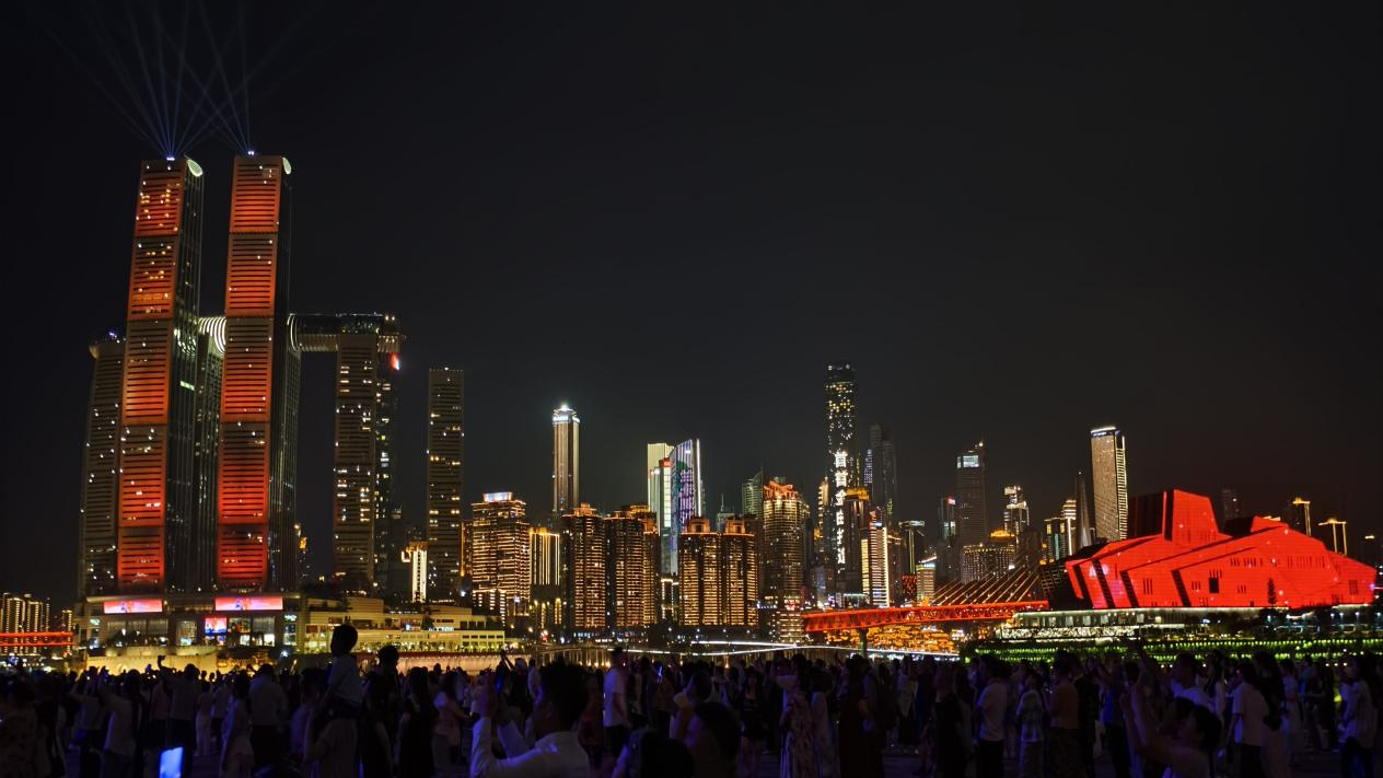 像徐先生一樣的游客數(shù)不勝數(shù),一場(chǎng)無(wú)人機(jī)燈光秀,為“兩江四岸”的天臺(tái)店鋪帶來(lái)了空前的流量。在南濱路、長(zhǎng)濱路、朝天門(mén)、江北嘴等地的江岸邊,以及各個(gè)高樓大廈的觀景臺(tái)上,擠滿(mǎn)了來(lái)自五湖四海的游客。