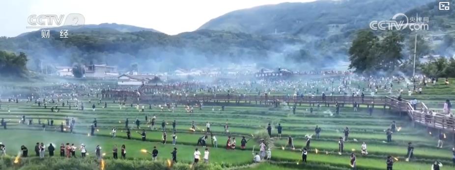 在越西縣,夏季避暑暨火把季系列活動(dòng)也輪番上演。除了有精美絕倫的非遺巡游,和極具視覺(jué)沖擊力的彝族傳統(tǒng)競(jìng)技,在越西縣普雄鎮(zhèn)陽(yáng)坡村的梯田上,一場(chǎng)原生態(tài)稻田火把秀更是吸引數(shù)以千計(jì)的游客前來(lái)。大家跟隨當(dāng)?shù)鼐用裨诘咎镩g點(diǎn)燃火把,用火焰驅(qū)逐害蟲。游客們手中的火把與稻田連成一片,場(chǎng)面蔚為壯觀。