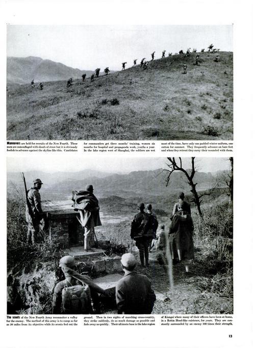 這是1939年7月出版的美國(guó)《生活》雜志第13頁(yè)影印件,展示了史沫特萊拍攝的新四軍訓(xùn)練和偵察的一些畫面。上圖:新四軍的新兵們開展戰(zhàn)術(shù)訓(xùn)練;下圖:新四軍的偵察小隊(duì)正在山谷中執(zhí)行敵情偵察任務(wù)。
