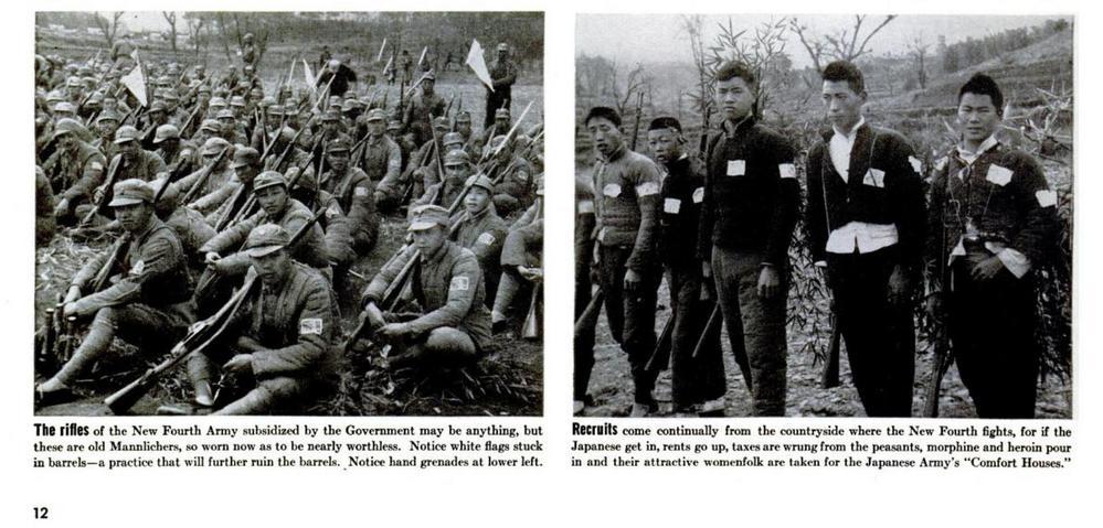 這是1939年7月出版的美國(guó)《生活》雜志第12頁(yè)影印件局部,展示了史沫特萊拍攝的新四軍的一些畫面。左圖:新四軍的裝備較為簡(jiǎn)陋;右圖:新四軍從作戰(zhàn)的農(nóng)村地區(qū)招募新兵。
