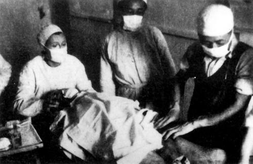 1939年,在安徽省宣城市涇縣云嶺鎮(zhèn),新四軍軍醫(yī)處醫(yī)務(wù)主任宮乃泉(右一)與加拿大護(hù)士瓊·尤恩(左一)等為戰(zhàn)士做手術(shù),照片由新四軍軍長(zhǎng)葉挺拍攝。
