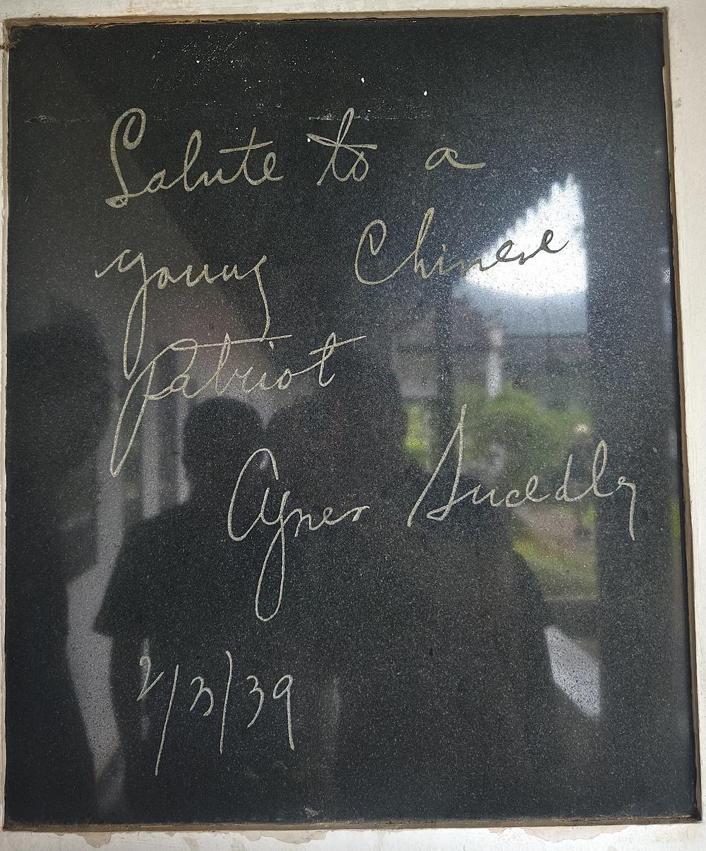 1939年史沫特萊寫給新四軍教導(dǎo)總隊(duì)學(xué)員葛涼的一句話語(yǔ),如今也被鐫刻在石碑之上——“Salute to a young Chinese patriot(向一位年輕的中國(guó)愛(ài)國(guó)者致敬)”。