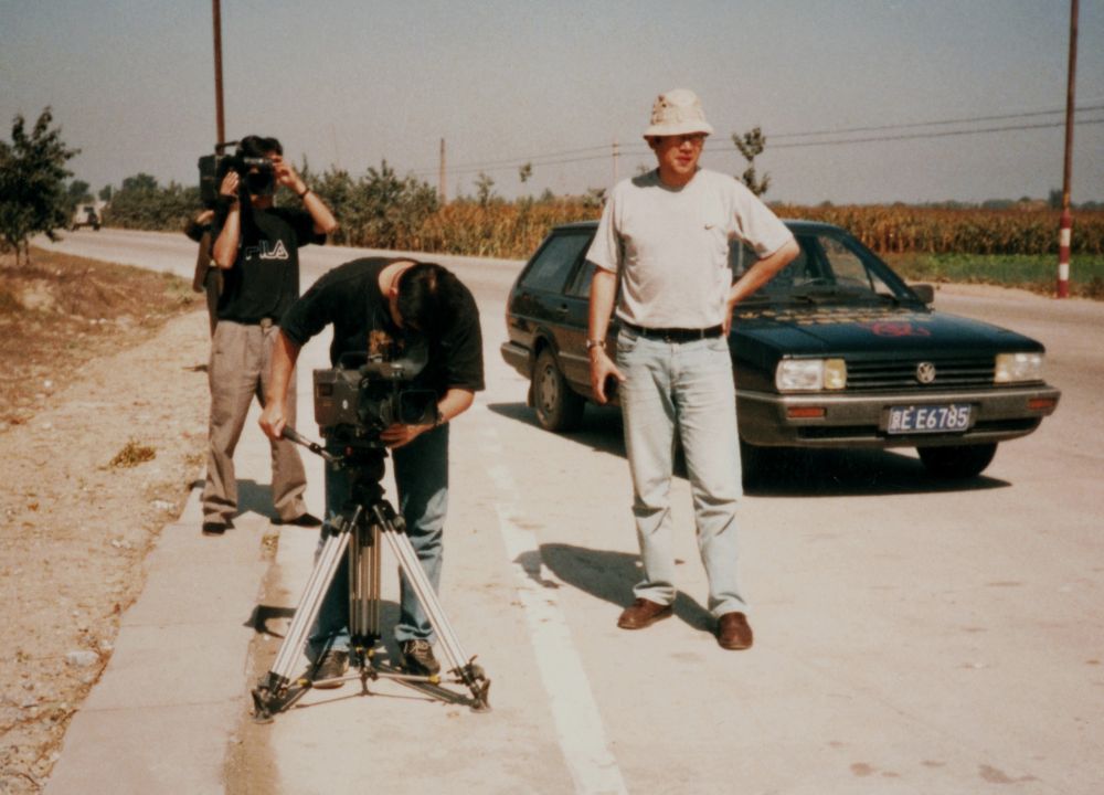馮雪松(右)和攝制組在保定當(dāng)年的戰(zhàn)地尋訪。孫進(jìn)柱 攝